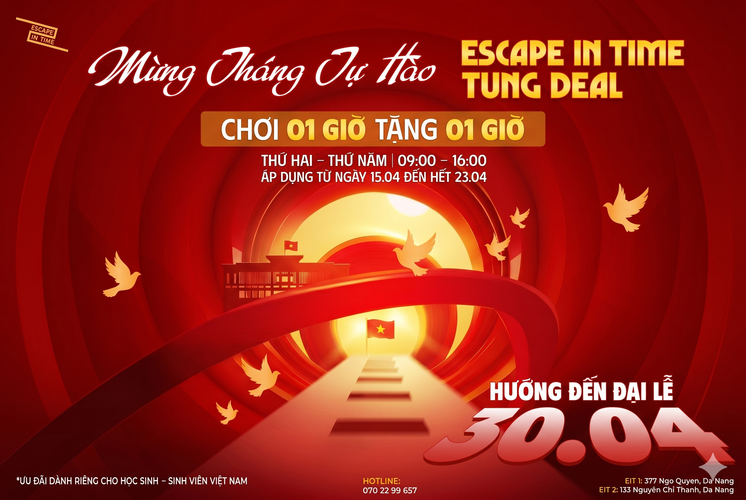 Chào mừng kỷ niệm 51 năm ngày Giải phóng miền Nam – Thống nhất Đất nước, không khí lễ hội đang tràn ngập khắp phố phường Đà Thành. Để hưởng ứng tinh thần “Tháng Tự Hào”, Escape In Time tung chương trình khuyến mãi 30/4 lớn nhất trong năm: Chơi 1 Giờ Tặng 1 Giờ. Đây chính là cơ hội vàng để các nhóm bạn trẻ trải nghiệm mô hình escape room hiện đại mà không lo về giá.